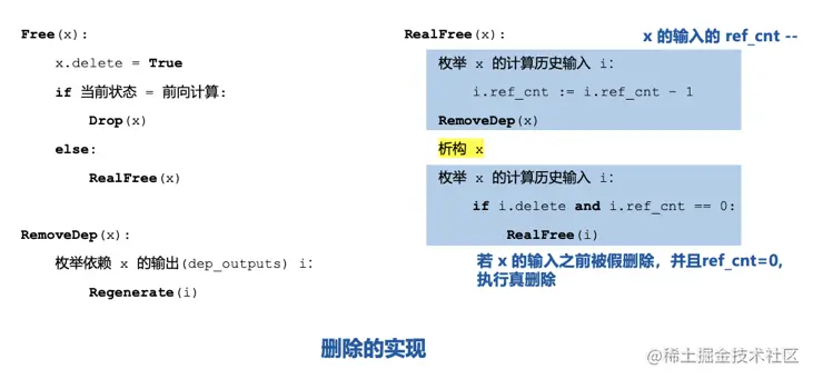 做完了上述操作之后,就可以真正释放掉该 tensor 对应的 tensorInfo 了。释放完还需要递归地检查 x 的计算历史输入 tensor,如果这些 tensor 中有 ref_cnt=0 且被打上删除标记的,就可以执行真删除。