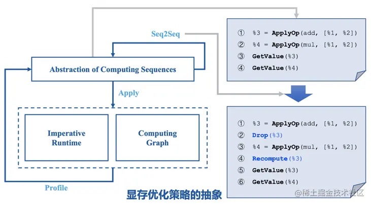 不论是静态图的 Sublinear 优化还是动态图的 DTR 优化,都可以看作是对执行序列做了一个 Seq2Seq 的变换——在序列中加入了一些 drop 和 recompute 语句。区别在于,静态图是获得了整个运行序列后,计算最优的释放和重计算序列;动态图则是在解释执行序列的过程中,当场插入 drop 和 recompute 语句。执行序列有两种方式:动态图 Imperative Runtime 解释执行和静态图 Computing Graph 编译执行。Profile 会在实际运行中,记录每个算子的运行时间、每个 tensor 在显存中停留的时长等运行时信息,之后用户可以根据 profile 的结果去调整计算序列。这样用户不需要了解底层的执行逻辑,也不用修改框架的源代码就可以针对不同的模型定制策略。