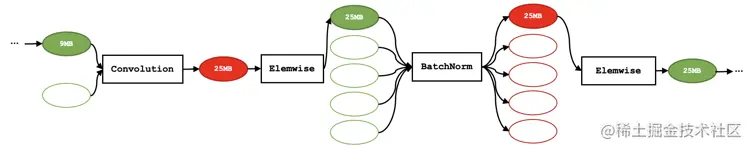 比如下面这张图是某张计算图的子图,可以看到一个 9MB 的 tensor 经过一个卷积算子,得到了一个 25MB 的 tensor,再经过一个 Elemwise 算子,得到一个 25MB 的 tensor,再经过 BatchNorm 算子和 Elemwise 算子,得到的都是 25MB 的 tensor。