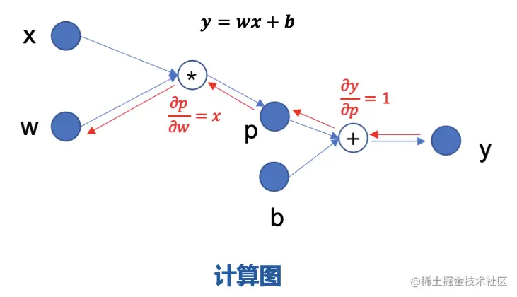 以 y=wx+b 为例,它的前向计算过程为输入 x 和参数 w 首先经过乘法运算得到中间结果 p,接着 p 和参数 b 经过加法运算,得到右侧最终的输出 y。