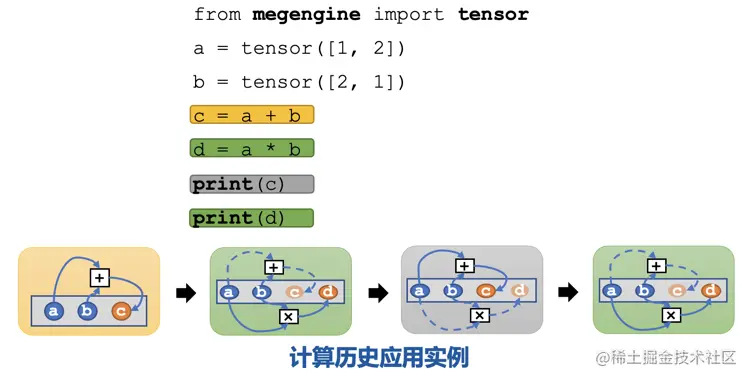 关于如何利用计算历史来释放和恢复 tensor,来看一个具体的例子:
