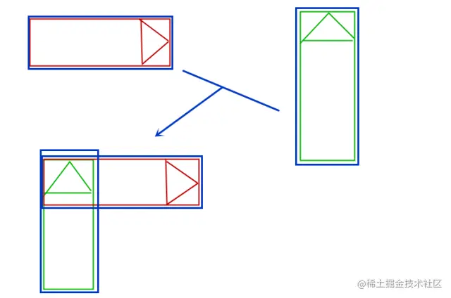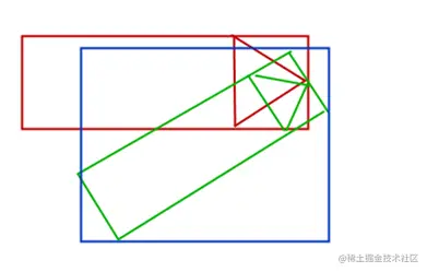 我们发现,旋转后的图片不仅面积变大了,导弹头的位置也变了。那应该怎么解决这个问题呢?思路是,每一次旋转图片以后,求出旋转图的头位置(图中的绿色箭头点),然后把绿图的打印位置移动一下,下,x,y分别移动两个头的距离,就可以让旋转后的导弹头对准实际我们参与运算的那个导弹头的位置,移动后应该是这样的: