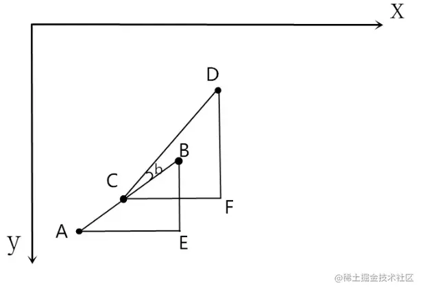 第一个是时间片构造出的三角形是ABE,经过一个时间片后,目标从B点走到了D点,导弹此时在C点,于是构造新的三角形CDF,重复刚才的计算过程即可,图中的角∠b就是导弹需要旋转的角度,现实中只需要每个时间片修正导弹的方向就可以了,具体怎么让导弹改变方向,这就不是我们需要研究的问题了
