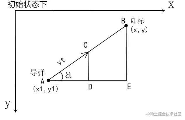 AC的长度就是导弹的速度乘以时间即 |AC|=vt,然后即可计算出AD和CD的长度,于是这一个时间片过去后,导弹应该出现在新的位置C点,他的坐标就是老的点A的x增加AD和y减去CD。
