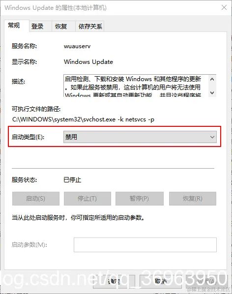 然后,Windows Update项上右键/属性,打开属性窗口,“常规”选项卡中,“启动类型”设置为“禁用”