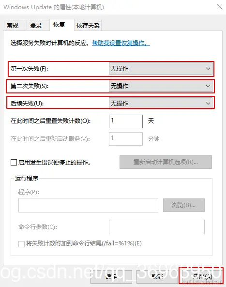 再然后,“属性”窗口切换到“恢复”选项卡,“第一次失败”“第二次失败”“后续失败”均设置为“无操作”,点击“应用”,如图: