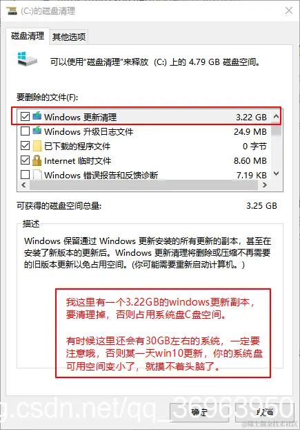 步骤三:新打开的磁盘清理窗口,已可以看到Windows更新清理,这就是windows更新遗留下来的文件,有的时候是几个G,有的时候是几十个G,勾选清理即可。