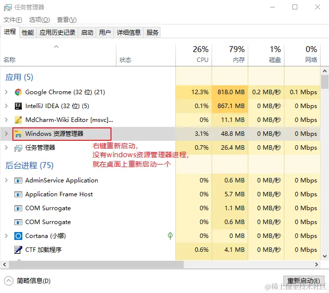 用"ctrl+shift+delete"组合键打开任务管理器.在弹出窗口中选择右下角的"详细信息(D)"在"进程"中下拉,找到"Windows资源dao管理器"鼠标右击"Windows资源管理器"选择"**重新启动**(R)".(如果没有window资源管理器在桌面上启动一个)