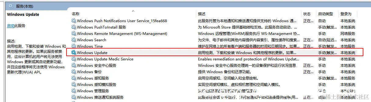 步骤二:服务中找到Windows Update这个服务(按字母序,很容易找到),如图: