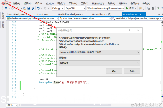 另外,还可以检查代码文件xxx.cs,亦将编码设置为合适的格式,可以解决MessageBox.Show()中文乱码问题;