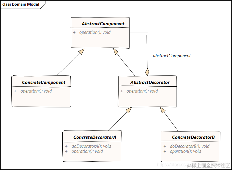 参与者: AbstractComponent抽象组件、ConcreteComponent具体组件、AbstractDecorator抽象装饰类、ConcreteDecorator具体装饰类
