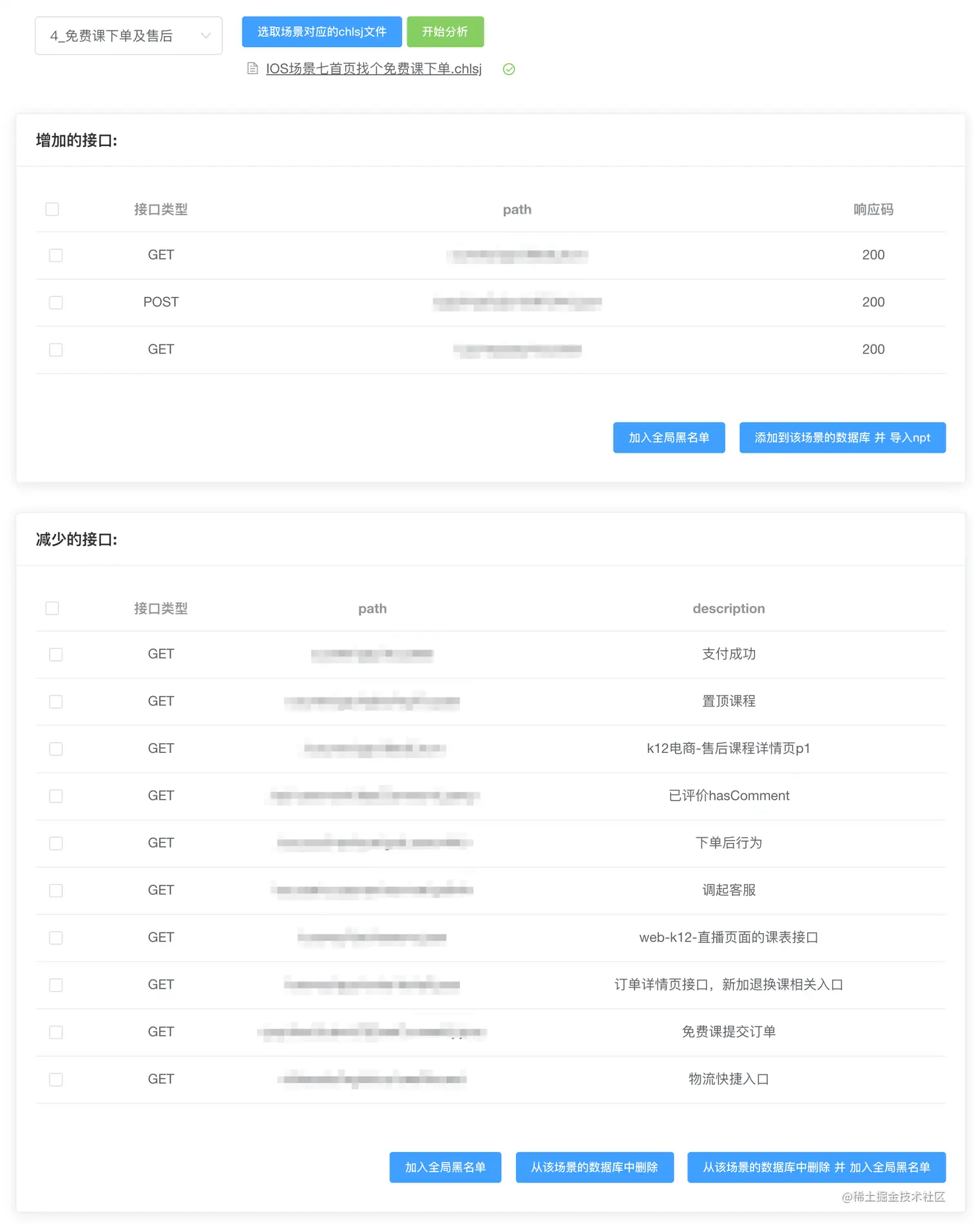 - 将SOP转化为接口路径。传统方式是抓包后,人工筛选、对比、整理抓包结果,再将接口变更情况手动同步到压测平台,该工作较繁琐且重复。这部分我们提炼成web工具后,仅需要上传抓包文件,就可以得到场景级别的接口增减情况,并支持“场景级别的接口列表维护”、“设置接口黑名单”、“接口一键导入压测平台”等功能,效果展示: