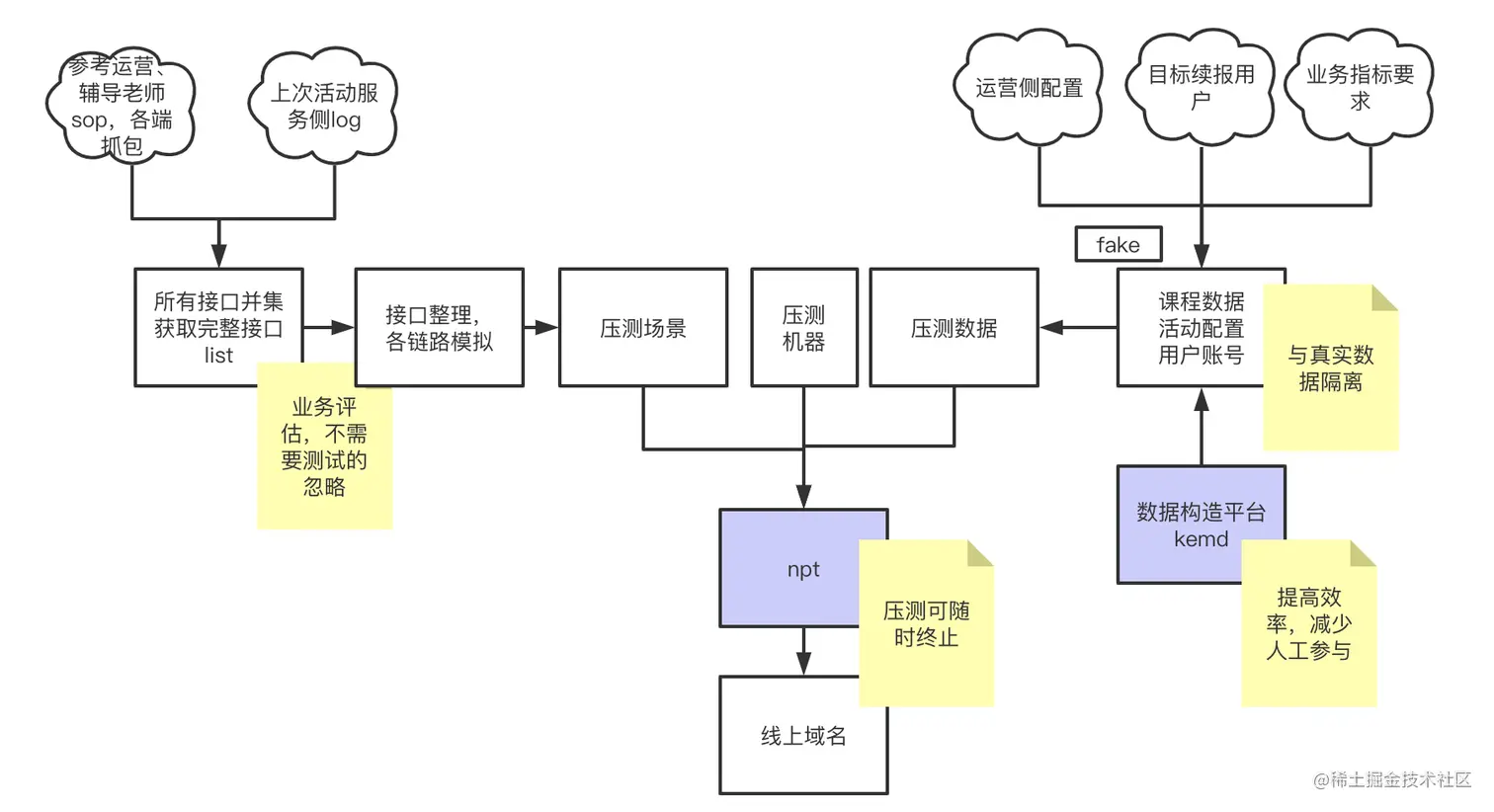 - 通过我们的自研工具,完成日志自动解析、接口列表补充、压测场景确定等工作。一部分处理流程如下:(备注:npt为杭研的压测平台简称)