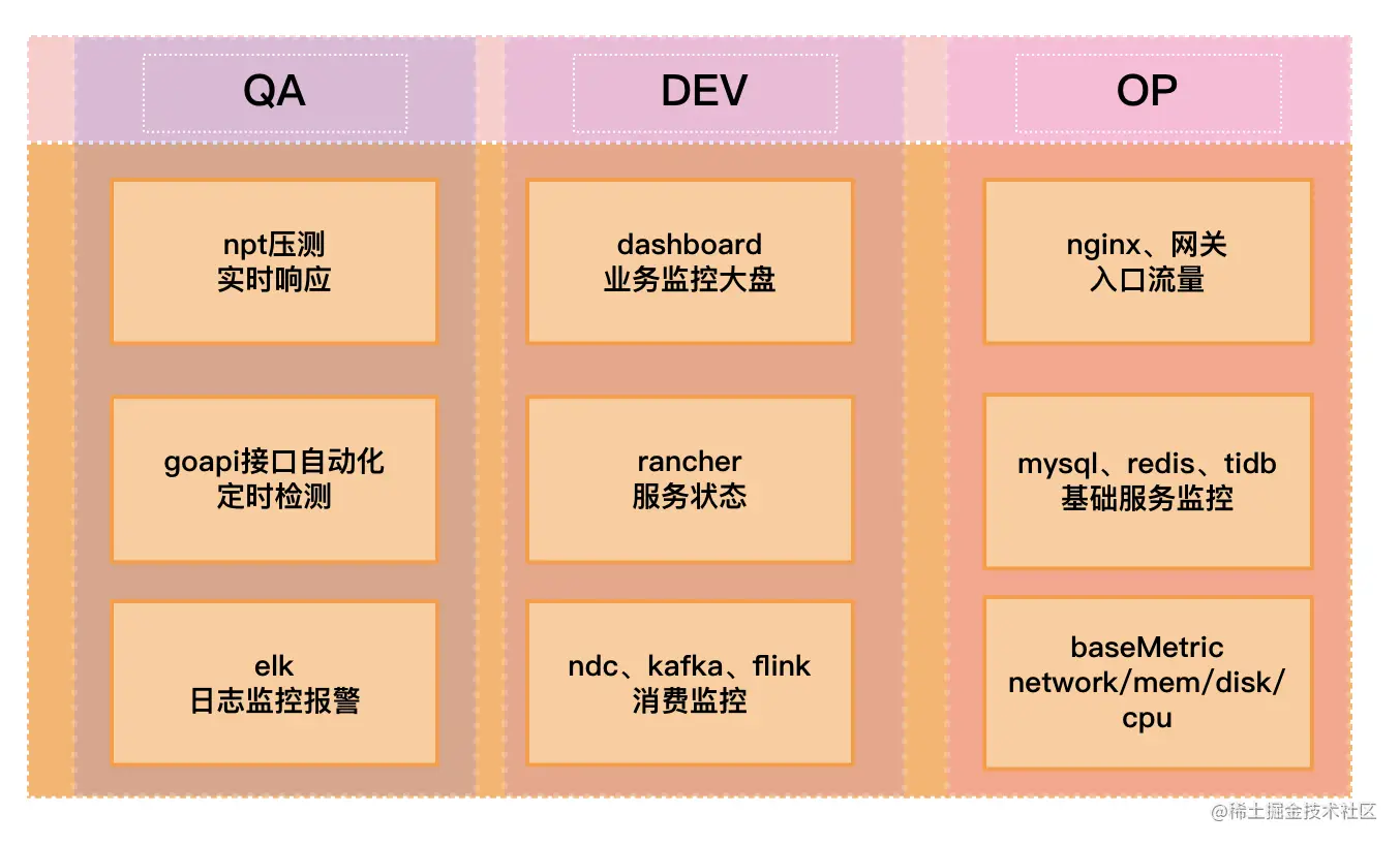 - 监控:测试现有监控手段是否能合理发现和暴露问题,以便对问题及时预警,做到早发现,早治理。