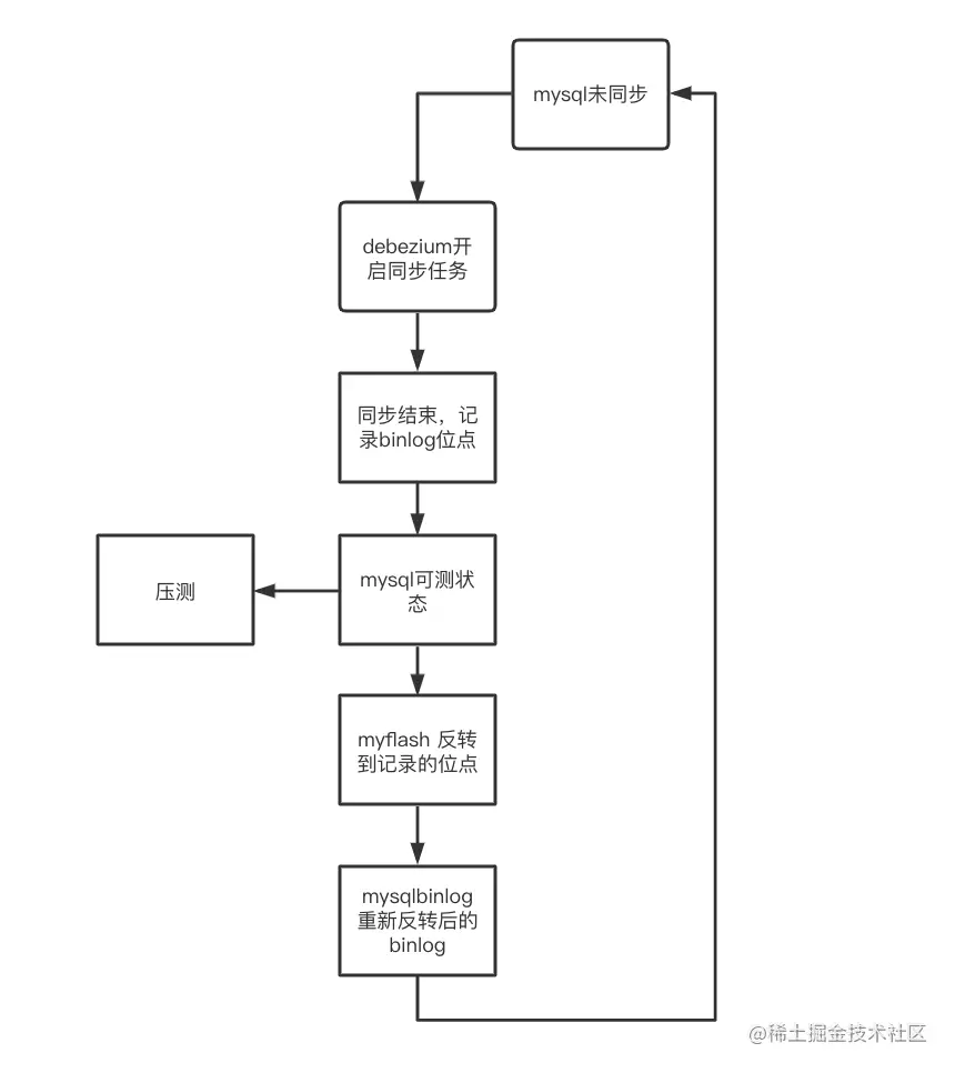 之前留给压测的时间比较紧张,为了保证测试结果的可靠性,我们直接使用线上环境压测,同时为了降低业务影响,只能在凌晨半夜进行测试,导致测试周期很长,相关人员都比较疲惫。经过沟通,开发和运维侧协助搭建了专属压测环境,服务部署独立实例、redis,kafka等相关中间件加prefix进行数据偏移,核心组件mysql单独部署实例,为了解决测试环境mysql数据量不够的问题及数据清理的问题,研发调研了mysql一键同步及回滚工具,流程如图: