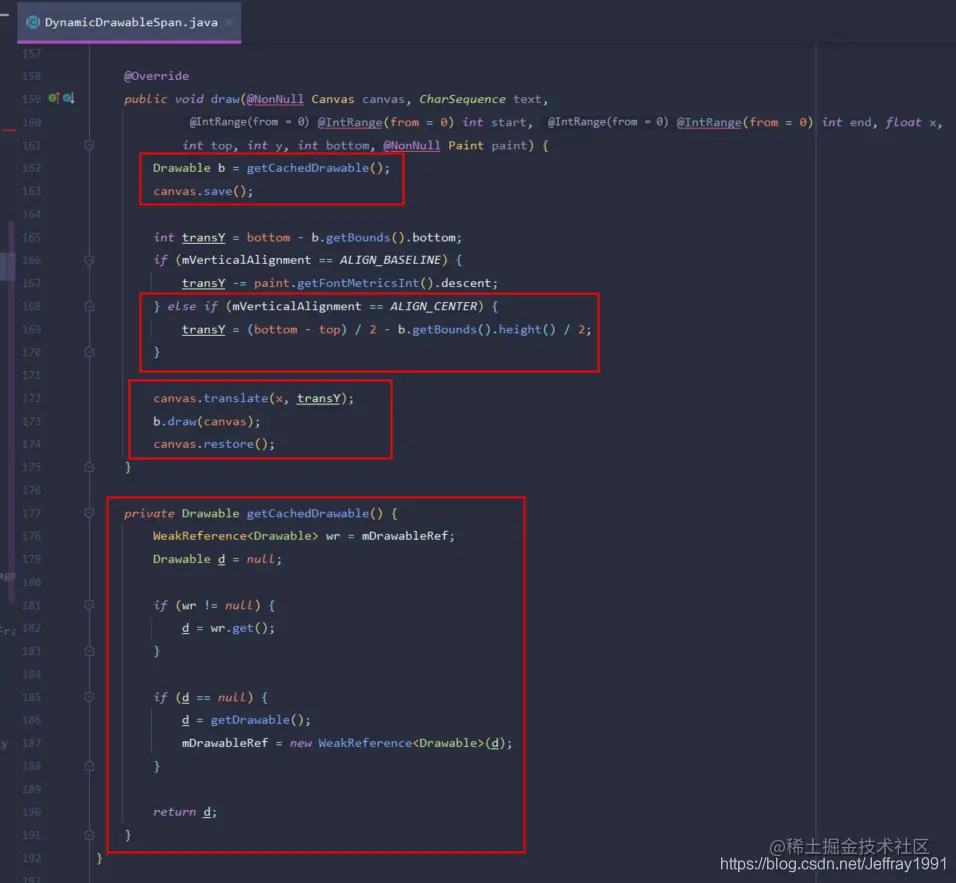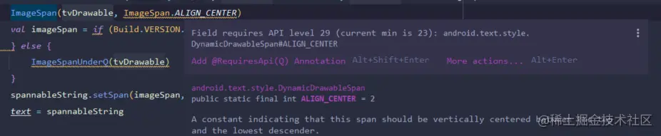 既然在 API 29 上能使用 ImageSpan.ALIGN_CENTER,那我们去看看源码的实现,将必要代码拉出来,自己写一个 ImageSpanUnderQ 类在 29以下使用不就完事了?