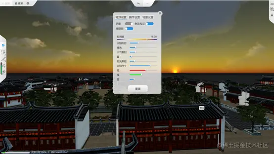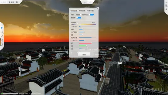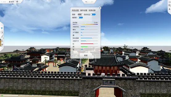 模模搭既然是搭建3D可视化场景的工具,那场景中怎么能少得了日出与夕阳呢,下面是我搭建的古城从日出到日落的一天。那这些不同的时间该怎么才能实现呢?