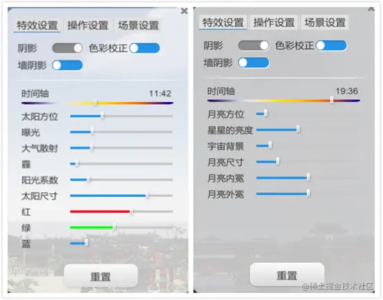 白天可以设置太阳方位、太阳尺寸、阳光系数等,夜晚可以设置月亮方位、星星亮度、月亮尺寸等。
