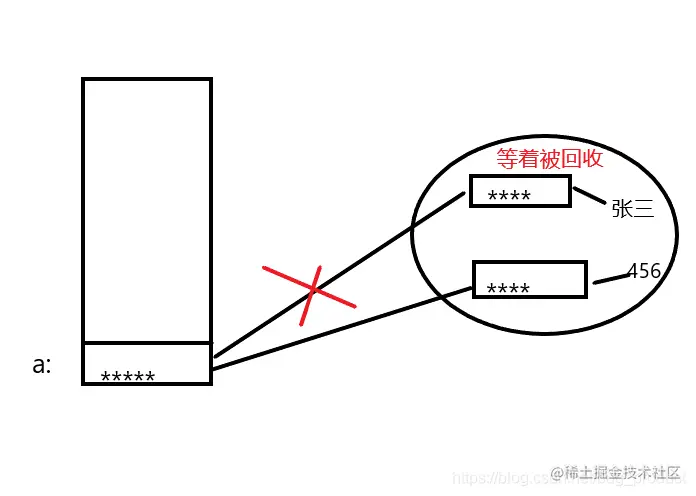 可以看出来,再次给a赋值时,并不是对原来堆中实例对象进行重新赋值,而是生成了一个新的实例对象,并且指向456这个字符串。a则指向最新生产的实例对象,之前的实例对象仍然存在,如果没有被再次引用,则会被垃圾回收。