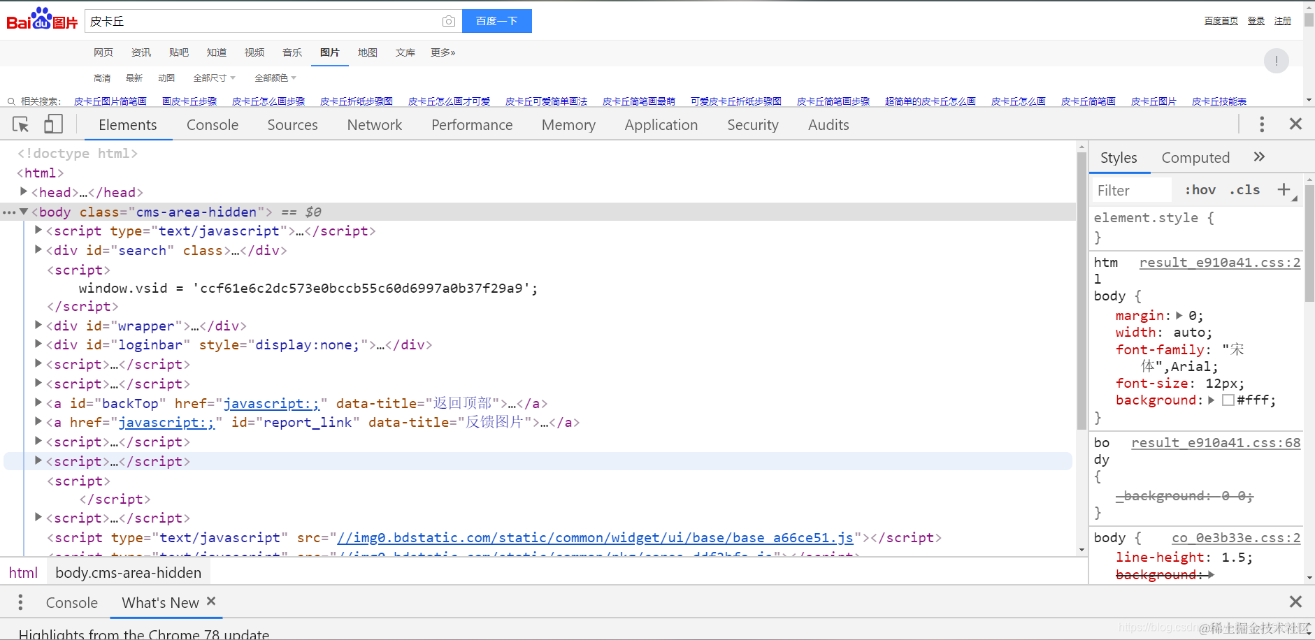 我们所看到的所有的网页都是由特定的代码组成的,这些代码中涵盖了这个网页中所存在的所有信息,在我们打开某一个网页的时候,按F12键就可以看到这个网页的代码了,我们以百度图片搜索皮卡丘的网页为例,按F12后,就可以看到如下的涵盖整个网页所有内容的代码了。