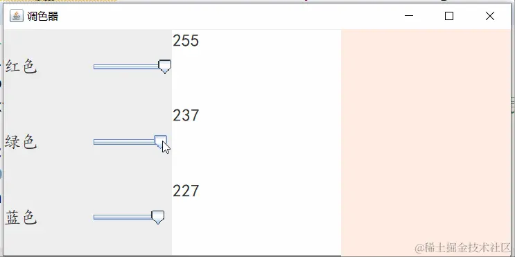 最近在做开发的时候有用到红、绿、蓝三色号的色彩调节,然后想使用某种色彩还需要去相关的网站上进行查询很是麻烦,于是就想着利用Java的GUI开发一个简单的调色器。可以自行调节色彩并且获取到对应的红绿蓝三种色号。