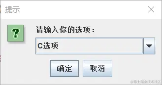 JOptionPane.showInputDialog(null,"请输入你的选项:","提示",JOptionPane.QUESTION_MESSAGE,null,options,options[2]);