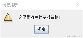 JOptionPane.showMessageDialog(null,"这里是消息提示对话框!","消息提示",JOptionPane.WARNING_MESSAGE); //消息对话框
