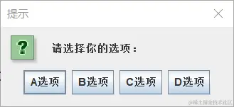 JOptionPane.showOptionDialog(null,"请选择你的选项:","提示",JOptionPane.YES_NO_OPTION,JOptionPane.QUESTION_MESSAGE,null,options,options[0]); //选择对话框*/