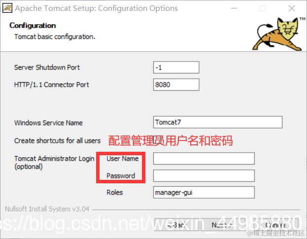 在安装到如下界面时,Tomcat会提醒我们进行管理员用户名和密码的配置,其作用是在我们之后再次打开运行Tomcat服务器的时候,就会输入相应的用户名和密码,同样这里在也可以选择不进行设置,直接点击下一步。