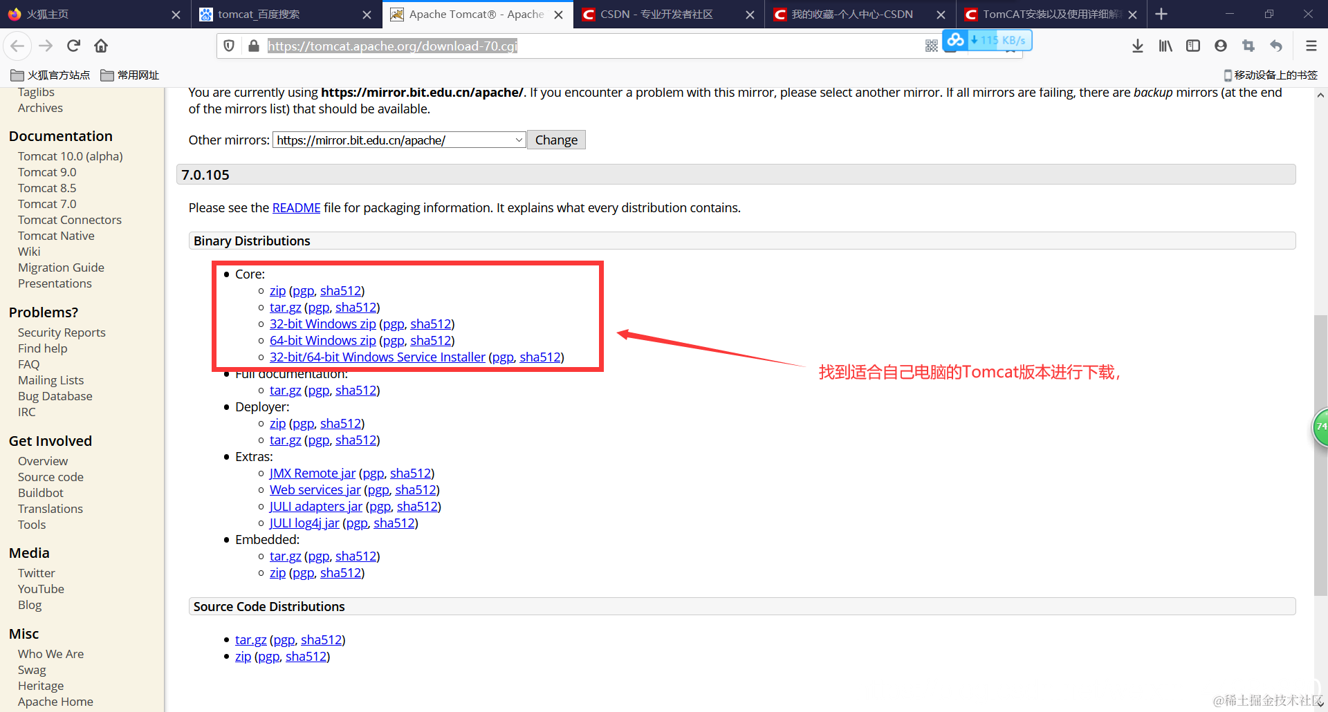在首页中我们可以根据自己电脑和JDK的不同版本,选择下载不同的Tomcat,在这里我使用的是JDK10,所以下载了最后一个。