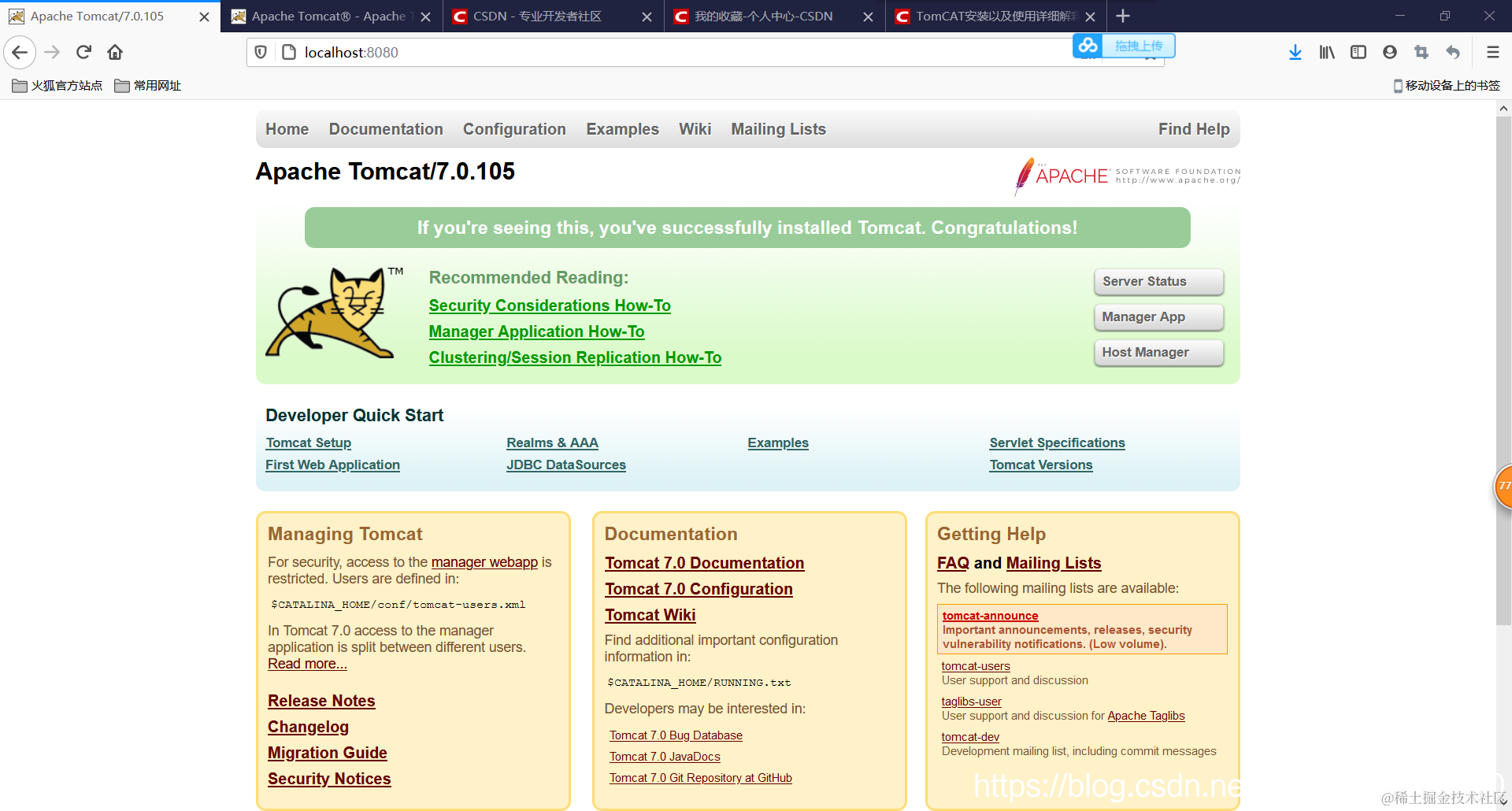之后在浏览器中输入http://localhost:8080 或者 http://127.0.0.1:8080localhost ,如果看到如下页面,证明启动成功