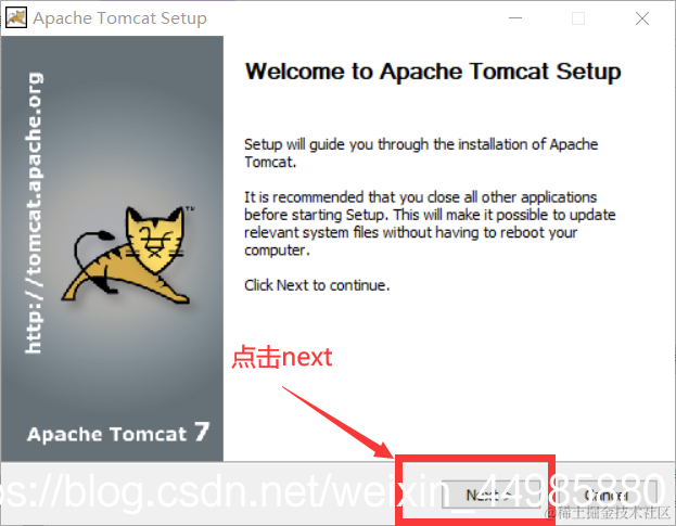 下载完毕之后,我们点击运行tomcat安装包就可以看到如下这样的界面,接下来几步只需要点击Next即可,