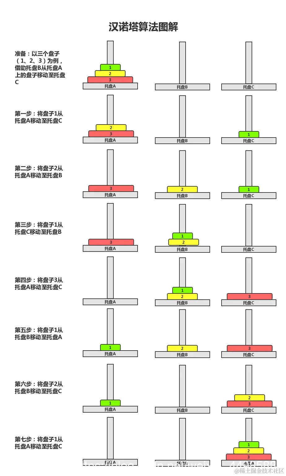 首先我们来看一个三层汉诺塔的图解,来对汉诺塔问题的解决有一个简单的了解: