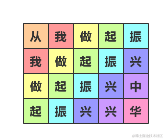比赛时,我站在左上角的写着“从”字的格子里,可以横向或纵向的跳到相邻的格子里,但不能跳到对角的格子或其他位置,一直要跳到“华”字结束,