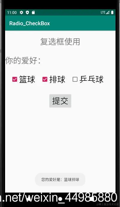 Toast.makeText(MainActivity.this,"您的爱好是:" + info,Toast.LENGTH_LONG).show();