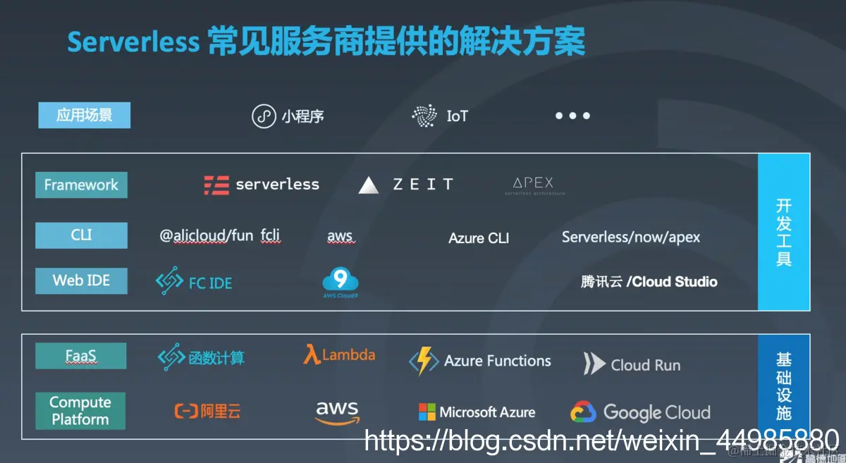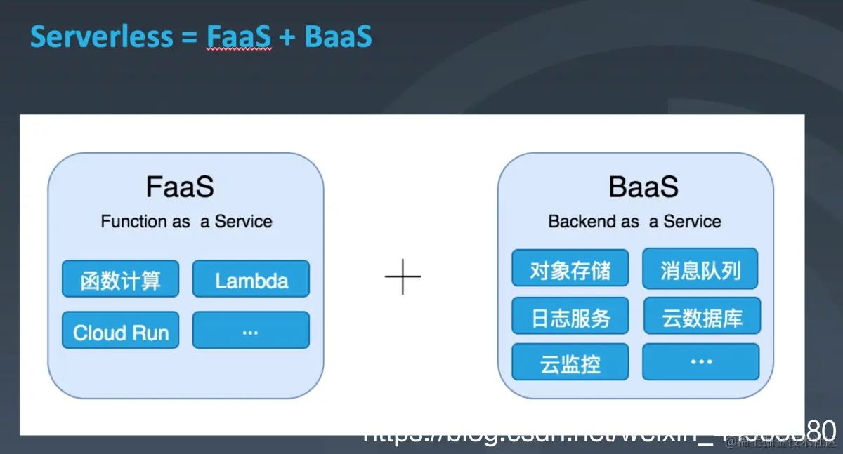 可能会有很多人问了,没有服务器,如何来将程序、应用运行起来呢?在这里要介绍Serverless包含的两个核心概念:函数即服务,Function as a Service FaaS,后端即服务,Backend as a Service BaaS。接下来对这两个概念为大家做一个介绍。