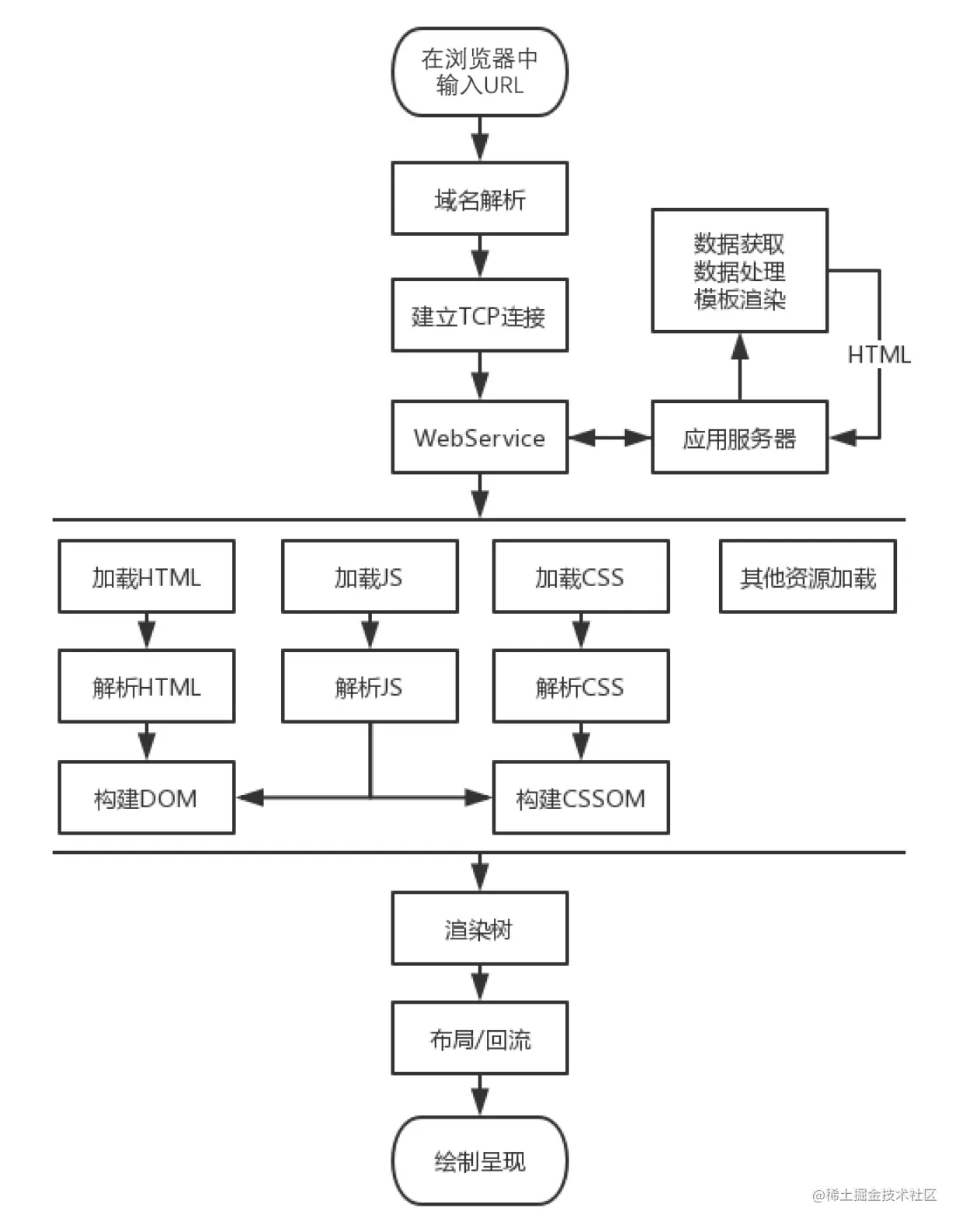 服务器返回HTTP请求后,浏览器开始接收数据,到最终在屏幕上显示内容需要完成以下步骤: