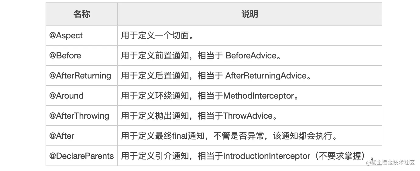 为此,AspectJ 框架为 AOP 开发提供了另一种开发方式——基于 Annotation 的声明式。AspectJ 允许使用注解定义切面、切入点和增强处理,而 Spring 框架则可以识别并根据这些注解生成 AOP 代理。关于 Annotation 注解的介绍如表所示: