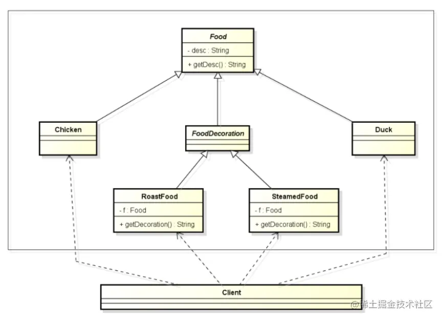 这里实体类是Chicken,装饰器是RoastFood,如果没有装饰器,调用cook()输出的是“鸡肉”,加上RoastFood装饰器修饰之后,调用cook()输出的是“烤鸡肉”,那么这个“烤”就是对“鸡肉”的装饰。