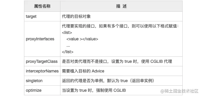 ProxyFactoryBean 类中的常用可配置属性如表所示: