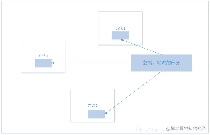 这种做法的不足之处在于如果有一天,上图中的深色代码段需要修改,那是不是要打开三个地方的代码进行修改?如果不是三个地方包含这段代码,而是100个地方,甚至是1000个地方包含这个代码段,那会是什么后果? 为了解决这个问题,通常会将图中所示的深色代码部分定义成一个方法,然后在三个代码段中分别调用该方法即可。在这种方式下,软件系统的结构示意图如图: