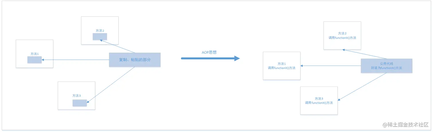 AOP像OOP一样,只是一种编程范式,AOP并没有规定说,实现AOP协议的代码,要用什么方式去实现,AOP和OOP一样只是一种编程思想,且看两种对比的方式理解AOP。