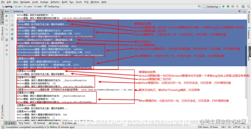 这里是AfterThrowing增强处理,打印目标方法中抛出的异常: java.lang.ArithmeticException: / by zero