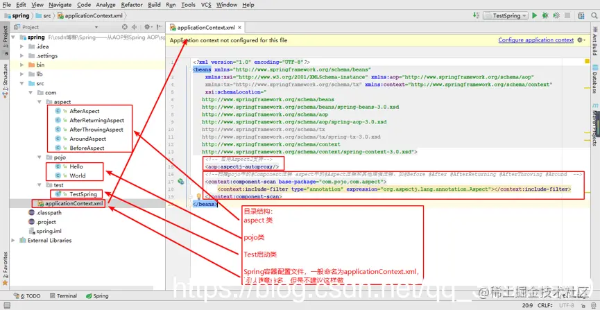 从Spring2.0开始, Spring AOP已经引入了对 AspectJ的支持,并允许直接使用 AspectJ进行AOP编程,而 Spring自身的 AOP API也努力与 AspectJ保持一致,因此,学习 Spring AOP就必然需要从 Aspect 开始,因为它是Java领域最流行的AOP解决方案,即使不用 Spring框架,也可以直接使用 Aspect进行AOP编程。