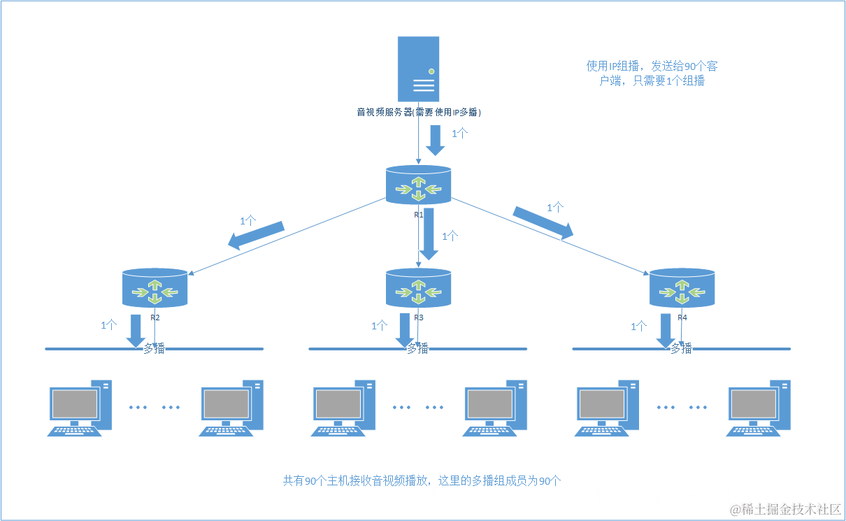 后继续转发。这样对发送者而言,数据只需发送一次就可以发送到所有接收者,大大减轻了网络的负载和发送者的负担。组播需要路由器的支持才能实现,能够运行组播协议的路由器称为组播路由器。