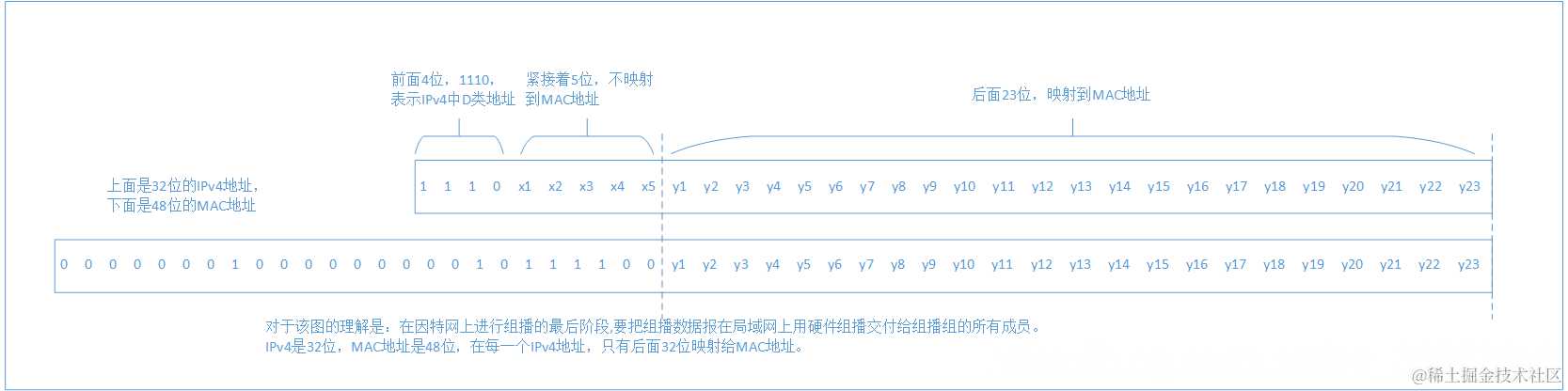 IANA拥有的以太网组播地址的范围是从01-00-5E-00-00-00到01-00-5E-7F-FF-FF,不难看出,在每一个地址中,只有23位可用作组播。这只能和D类IP地址中的23位有一一对应关系,D类IP地址可供分配的有28位,可见在这28位中的前5位不能用来构成以太网的硬件地址。