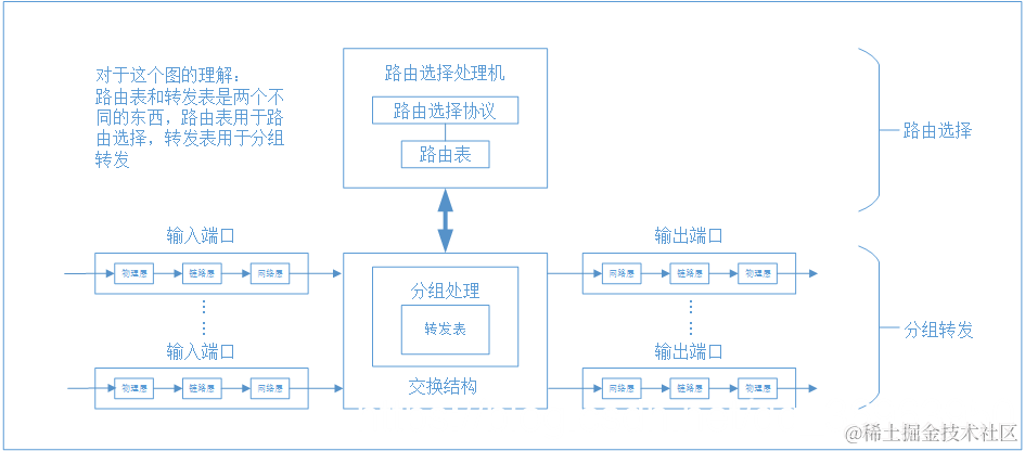 2)分组转发:路由器根据转发表将用户的IP数据报从合适的端口转发出去。
