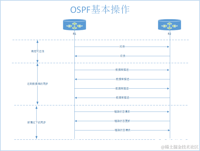 链路状态路由算法要求每个参与该算法的结点都有完全的网络拓扑信息,它们执行下述两项 务,第一,主动测试所有邻接结点的状态。两个共享一条链接的结点是相邻结点,它们连接到 算同一条链路,或者连接到同一广播型物理网络。第二,定期地将链路状态传播给所有其他的结点 (即所有其他路由结点),典型的链路状态算法是OSPF算法(第四部分-路由协议会介绍这个OSPF算法)。