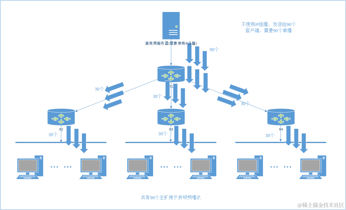 一个音视频服务器服务于90个主机,就是刚才上面那个图(刚才是为了对比不使用组播和使用组播,这里是为了对比网络组播和硬件组播) 。