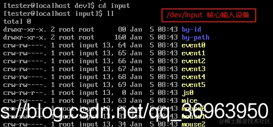 /dev/input的目录是用来存放输入设备的,这里展示笔者虚拟机上的截图,对于上面的/dev目录结构图。